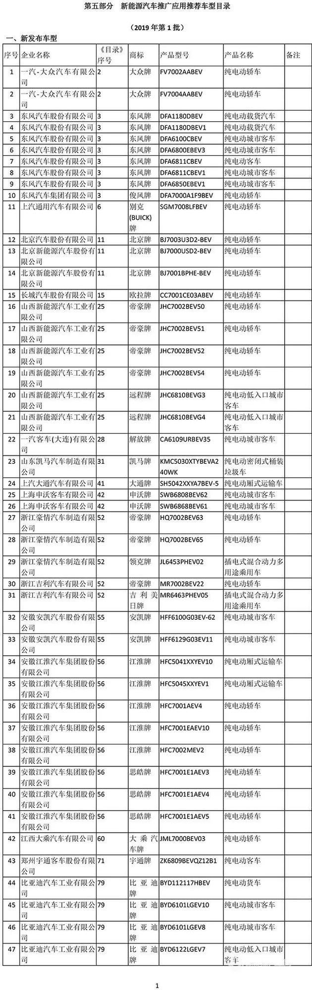 工业和信息化部日前公布了第316批《道路机动车辆生产企业及产品公告》。其中,2019年第1批《新能源汽车推广应用推荐车型目录》共包括49户企业的106个车型,纯电动产品共48户企业98个型号、插电式混合动力产品共7户企业8个型号。